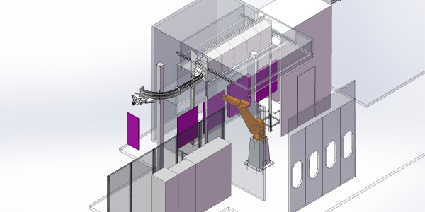 Lakovací robotické pracoviště panelů je určeno k nanášení vrstvy základové barvy. Jedná se o provedení v ATEX prostředí.
