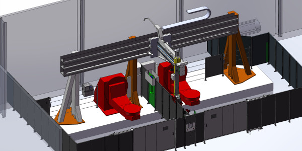 Svařovací pracoviště s portálovým pojezdem se zavěšeným robotem a dvěma polohovadly. Slouží ke svařování rozměrově větších výrobků.