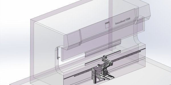 Testovací pracoviště pro robotickou obsluhu ohraňovacího lisu.